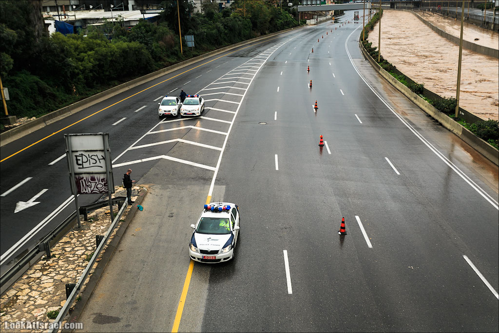 Ехал я на работу сегодня и поражался, что на каждом перекрестке стоит полиция. А когда увидел что въезд на Южный Аяйлон тоже перекрыт, то понял что это “вжжжж…” не с проста. В 10 утра наш оффис все еще был пуст от работников. Каждого одинокого, мокрого и громко матерящегося мы встречали апплодисментами. Мне же все не сиделось спокойно. Во мне бушевал фотограф, требующий действий. Видео кадры новостей и фотографии в интернете вносили смуту в мое бытие… В 11:29 я не выдержал и сорвался в район перекрестка Ха-Алаха и заодно Арлозоров, дабы заснять это историческое событие – РЕКА АЯЛОН мстит Тель Авиву за всё и парализует Гуш Дан!!!